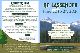 Mt. Lassen Journey Farthest Out is part of an ecumenical Christian movement begun in 1930 through the vision of Dr. Glenn Clark. It is a time set apart for spiritual growth as we open our lives to God physically, mentally, emotionally, and spiritually. We have a vision that our camp is a place where all people are accepted with the unconditional love that Jesus shares. Mt Lassen JFO is one of 4 camps in the JFO family. Check out JFOCamps.com for more information on all the Journey Farthest Out camps.